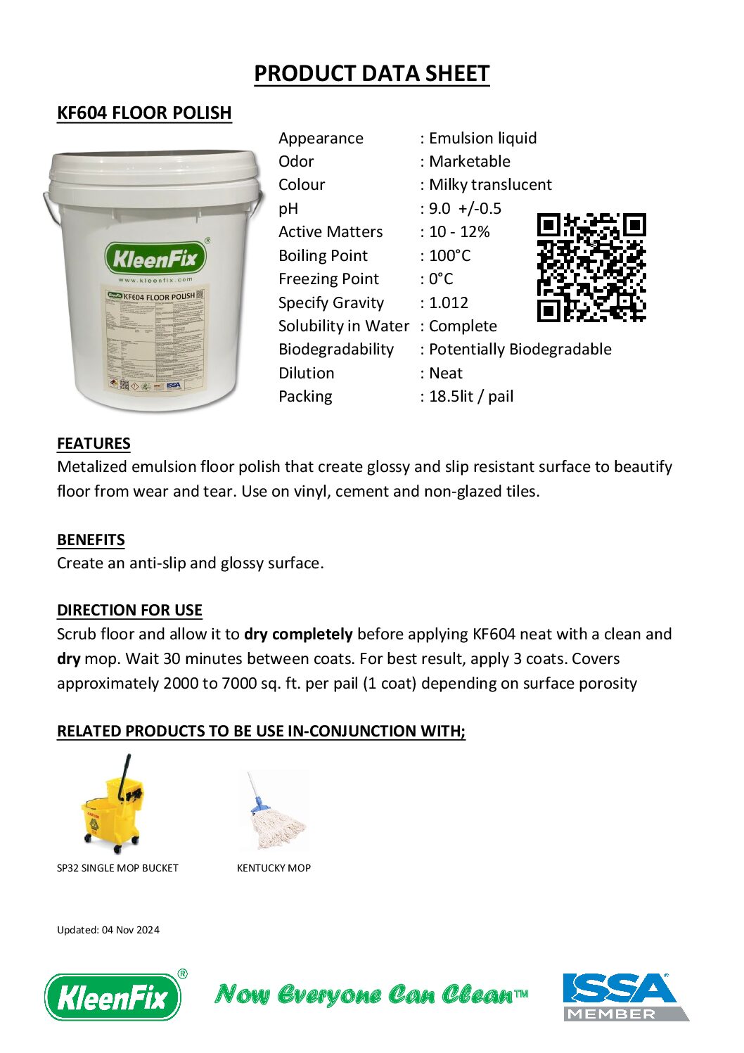 Strip old floor polish with KF602 if applicable. Scrub floor and allow to complete dry. Use a clean and dry mop and bucket to apply two or more coats to obtain gloss. Wait 30 minutes between coats.