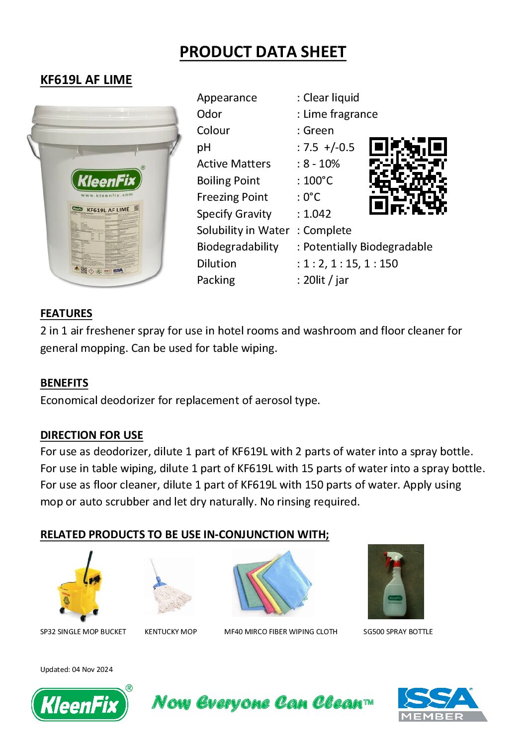 2 in 1 air freshener spray for use in hotel rooms and washroom and floor cleaner for general mopping. For use as air freshener, dilute 1 part of KF619L with 2 parts of water into a spray bottle. For use as floor cleaner, dilute 1 part of KF619L with 150 parts of water. Apply using mop or auto scrubber and let dry naturally. No rinsing required.