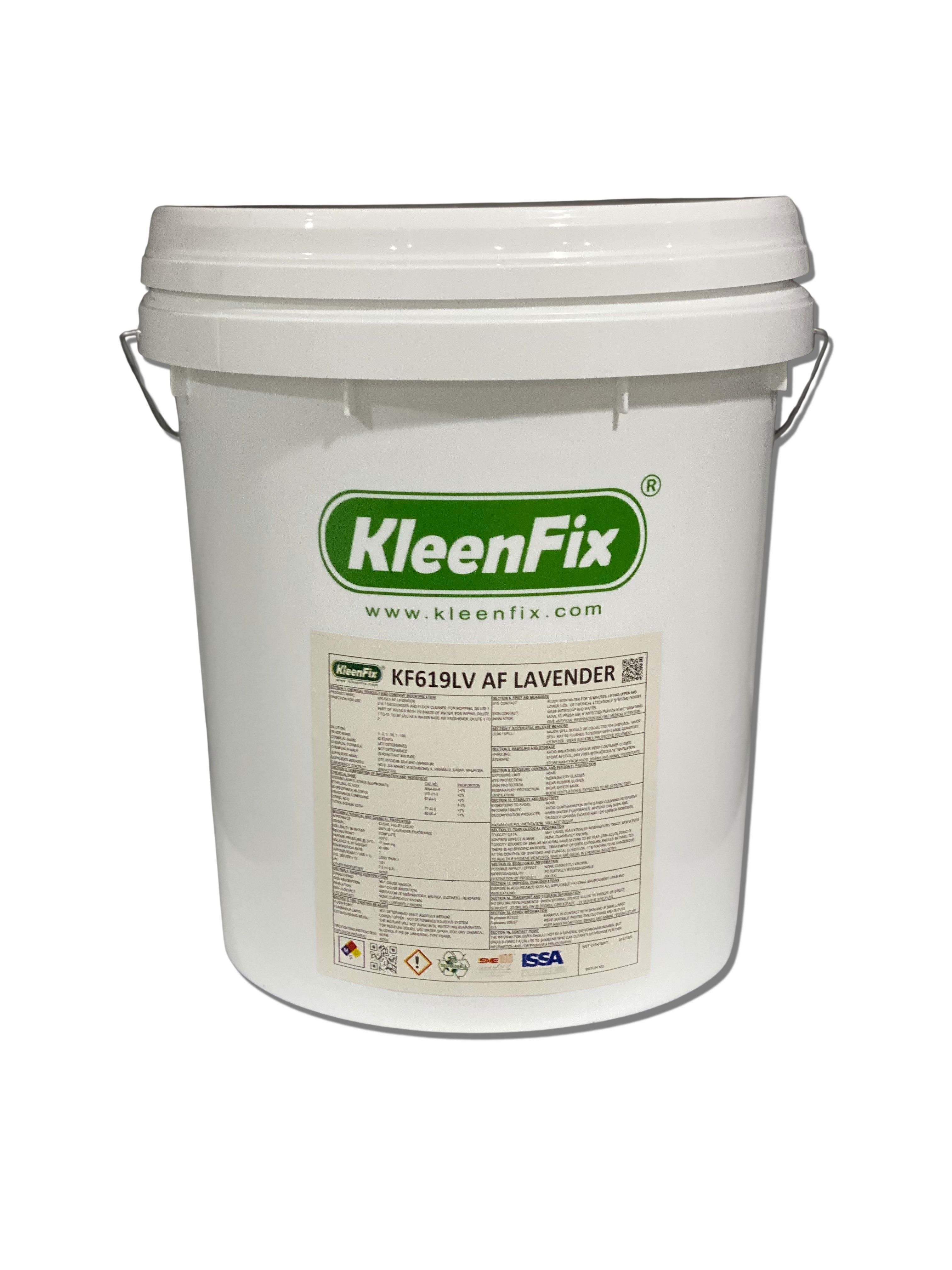2 in 1 air freshener spray for use in hotel rooms and washroom and floor cleaner for general mopping. For use as air freshener, dilute 1 part of KF619LV with 2 parts of water into a spray bottle. For use as floor cleaner, dilute 1 part of KF619LV with 150 parts of water. Apply using mop or auto scrubber and let dry naturally. No rinsing required.