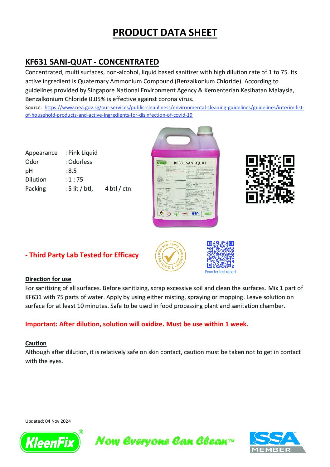 For sanitizing of all surfaces. Before sanitizing, scrap excessive soil and clean the surfaces. Mix 1 part of KF631 with 75 parts of water. Apply by using misting, spraying or mopping. Leave solution on surface for at least 10 minutes. Safe to be use in food processing plant and sanitation chamber. Compatible with all types of misting machine except heater type.