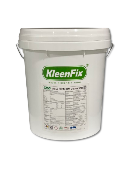 For dishes, cutlery, glassware, pots and pans & other cooking utensils, dilute 1 part of KF659 with 100 parts of water.