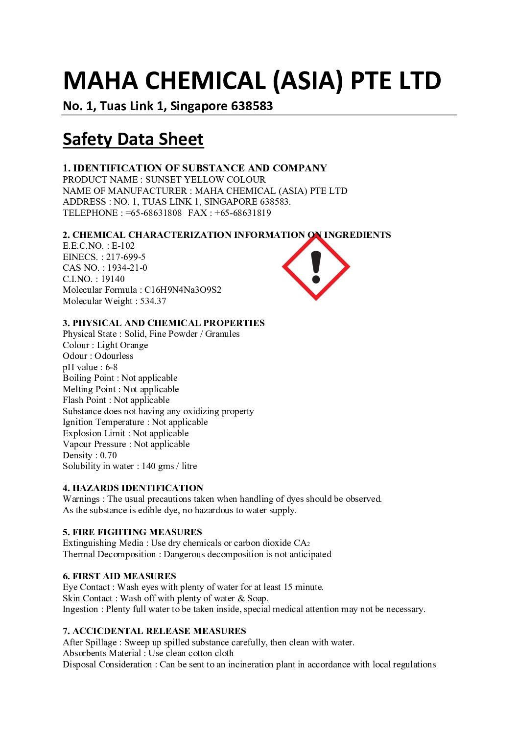 Download SDS : SUNSET YELLOW SDS 2025